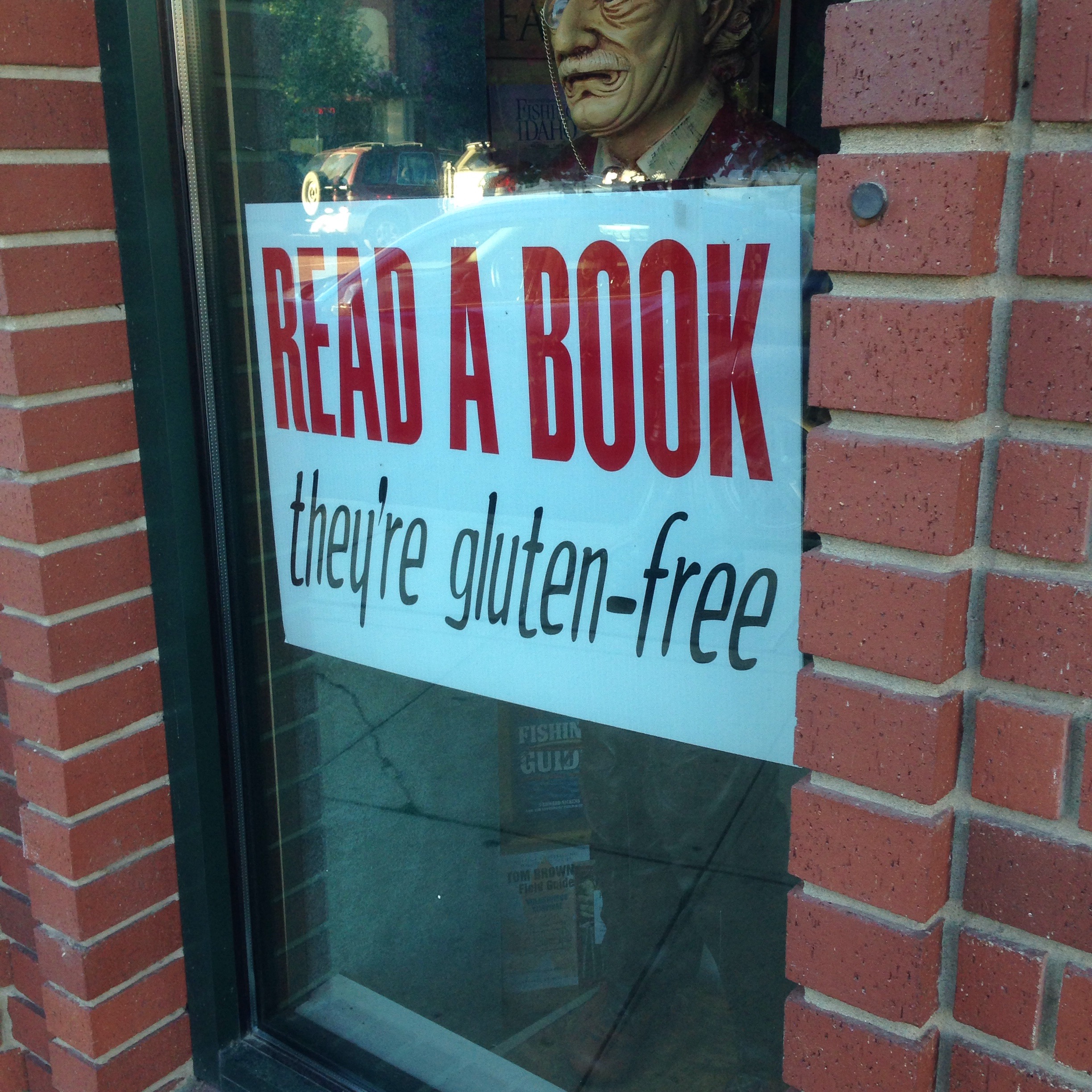 Gluten-free is the new buzz in product promotion. I spotted a sign signifying a snack as being gluten-free: an apple? Really. I did have to stop and click when I came across this sign in a used books store display window: