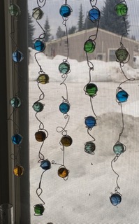 Not wanting to be accused of losing my marbles (I have sometimes issued a barbaric YAWP when winter blahs strike), I hung them up in my kitchen window. Instead of viewing mounds of snow I now gaze on droplets of colored glass. It has made a difference.