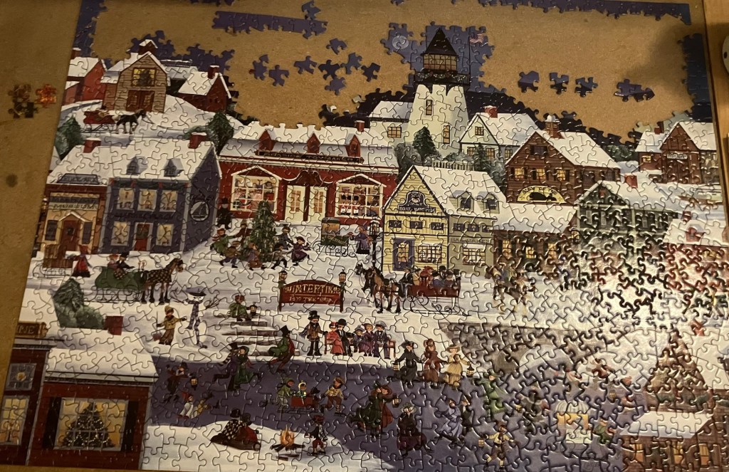 I grew up with puzzles. My dad had a special table set up and would spend hours piece by piece putting together some scenic masterpiece. I wasn’t too interested in doing puzzles then and barely acknowledged them over the years.