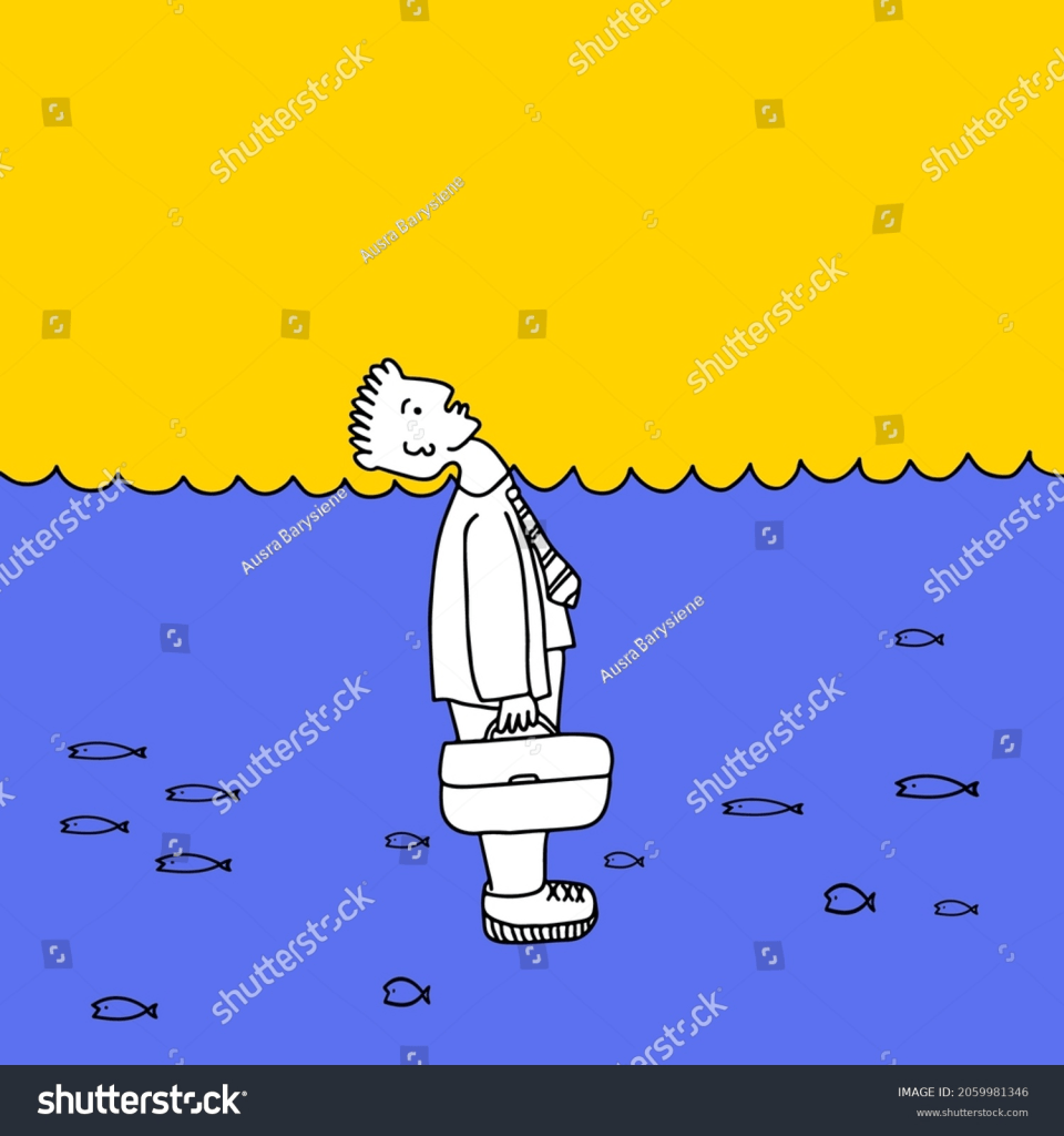 In over one’s head: to be unable to meet the demand of the situation. The saying is a reference to being in water too deep for one’s ability to swim. Other situations, beyond swimming in too deep of water, can be referenced such as paying bills or dealing with work responsibilities.