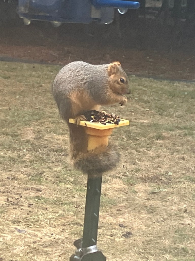 Outside my office window. One of our resident squirrels enjoying his bounty.